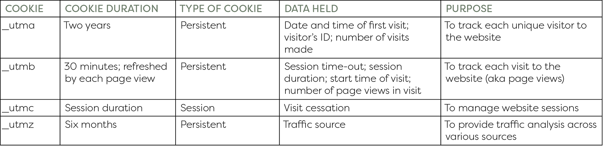 The list of cookies we use on our Website is depicted below: